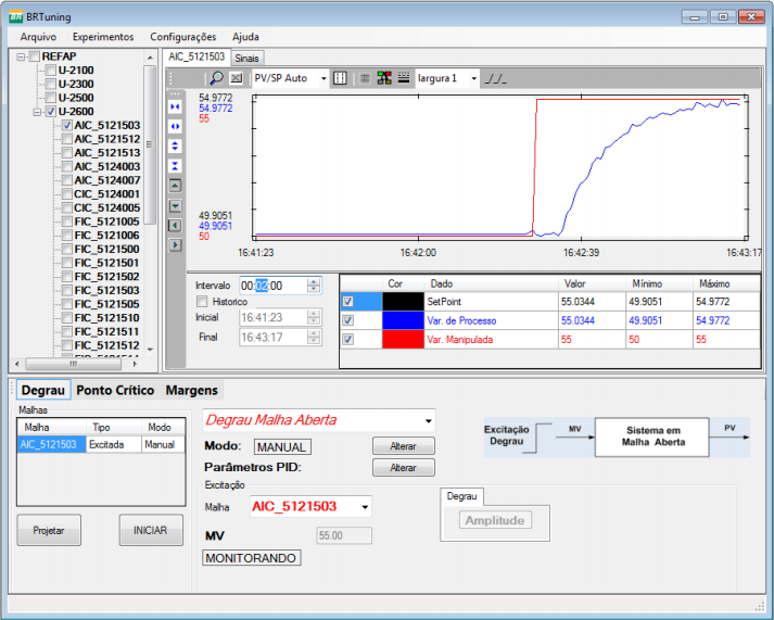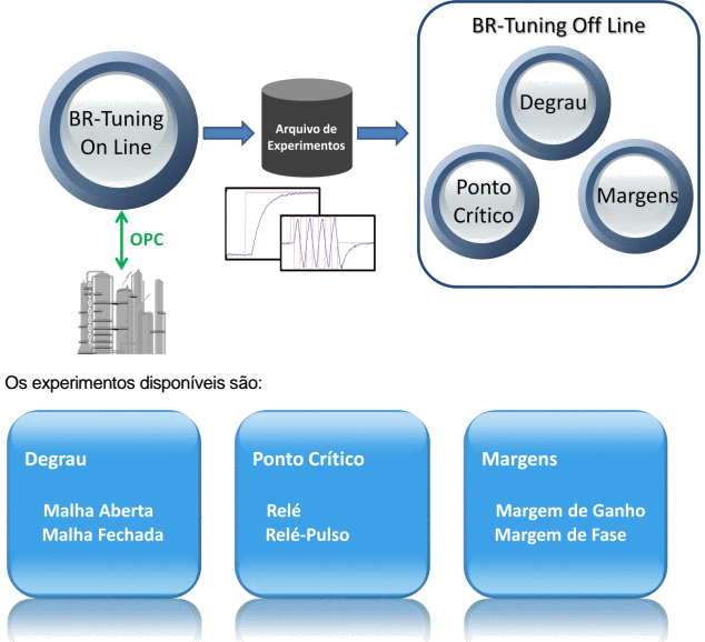 Módulo que possibilita ao usuário realizar experimentos para aplicação de perturbações (sinais de excitação) na planta industrial com o objetivo de levantar as informações sobre a dinâmica do processo necessárias para identificação e sintonia das malhas de controle. Os sinais de excitação podem ser do tipo DEGRAU ou RELÉ e aplicados tanto em malha aberta quanto em malha fechada. Esse módulo possui um cliente OPC que se comunica com o servidor OPC da planta industrial para a realização de experimentos. Os dados são coletados durante os experimentos e salvos em arquivos que serão utilizados pelos módulos Offline para identificação do processo e projeto do controlador PID.